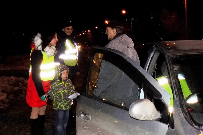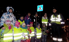 Участники акции, одетые в светоотражающие жилеты, агитировали водителей и пешеходов остроумными тематическими «кричалками» и плакатами, вручали специальные памятки и световозвращающие ленты для размещения на одежде.