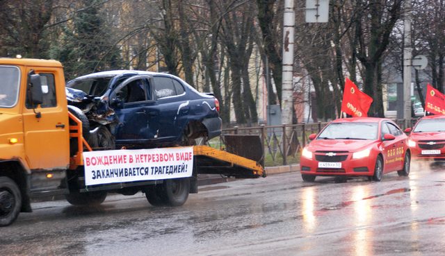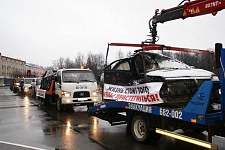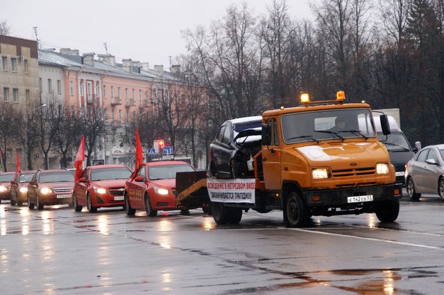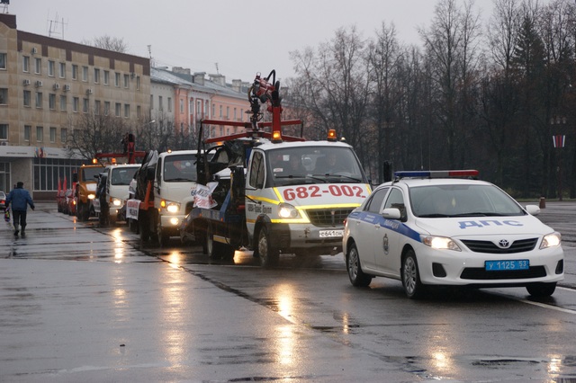 Колонна эвакуаторов с поврежденными в ДТП автомобилями, лозунгами о соблюдении элементарных Правил дорожного движения, автомобилями таксомоторных парков с яркими флагами проехала по улицам областного центра.