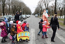 Автоинспектор в костюме сказочного героя повторил с детьми правила безопасности и, пройдя по пешеходным переходам, проверил навыки ориентирования по безопасному маршруту, продемонстрировав грамотное передвижение по дорогам.