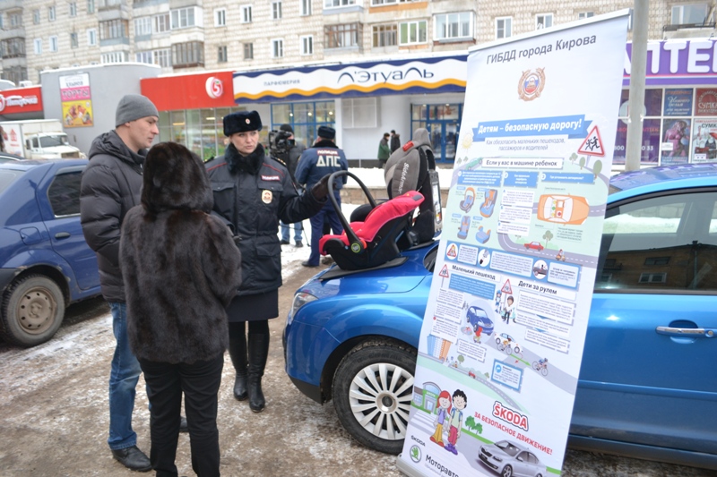В преддверии Дня ребенка мобильные экипажи ГИБДД рассказывают кировским автомобилистам об основных требованиях, предъявляемых к детским автокреслам.