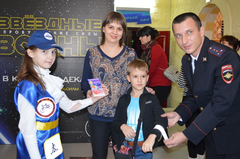 Между сеансами в холле кинотеатра отряды ЮИД проводили викторину по ПДД, конкурсы, показывали сценки. Активно участвующие зрители получили полезные сувениры: дети – световозвращающие браслеты и наклейки, взрослые – детские удерживающие устройства для автомобиля.