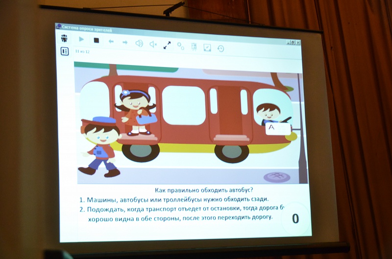 Для учащихся старших классов предусмотрена презентация и интерактивная викторина на знание ПДД, которая проводится с помощью беспроводных пультов. После опроса на экран выводится общая статистика, затем ребята подробно разбирают вопросы, в ответах на которые были допущены ошибки.