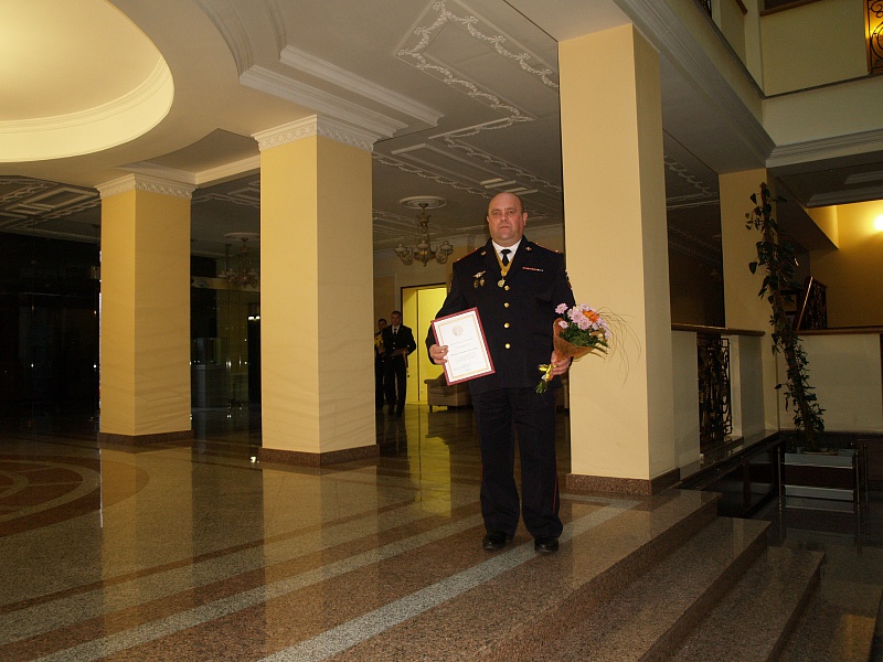 Такой наградой сотрудник ГИБДД удостоен за спасение человека, попавшего после ДТП в снежный плен. Водитель совершил опрокидывание, получил травмы головы и не смог сориентироваться, где он находится. Связавшись с родными посредством сотовой связи, он сообщил, что находится «где-то в поле и видит только светящиеся точки окон домов либо уличных фонарей». Водитель не смог выбраться из автомобиля и продолжал ожидать помощь.