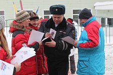 Во время спортивного мероприятия автоинспекторы провели акцию «Спорт и ПДД» и вручили юным участникам, которые бежали первыми, световозвращающие элементы - значки и ленты. Остальные участники забега получили памятки о необходимости соблюдения Правил дорожного движения.