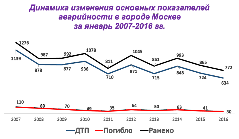 Необходимо отметить, что приведенные показатели, характеризующие состояние аварийности в городе Москве за январь 2016 года, являются самыми низкими за последние 10 лет.