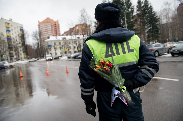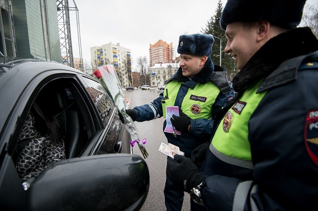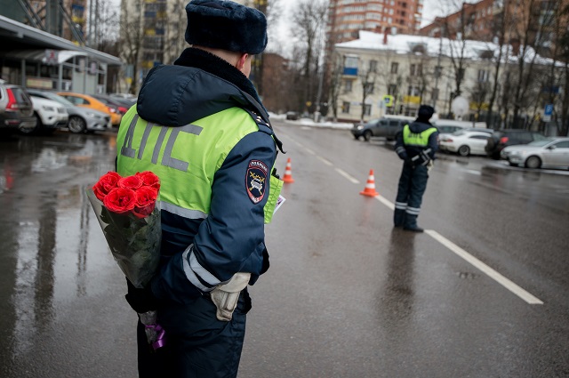Таким необычным поздравлением автоинспекторы уже подняли настроение прекрасной половине человечества в Химках. Сотрудники полиции останавливали автомобили, читали стихи женщинам и вручали букеты цветов.