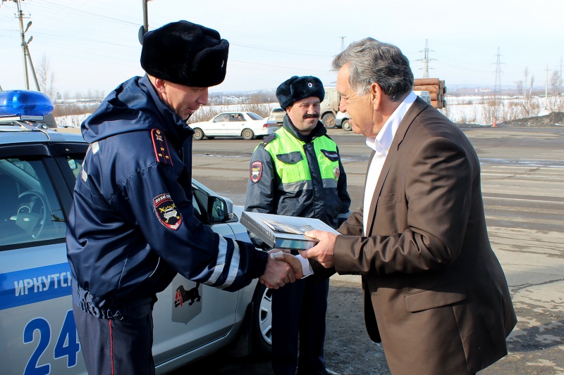 Председатель общественного совета при ГУ МВД России по Иркутской области Анатолий Стрельцов наградил инспекторов ГИБДД Александра Мирошниченко и Алексея Иванова, принявших участие в спасении жизни ребенка. На посту ДПС он вручил им памятные книги известного писателя Валентина Распутина и пригласил на лучшие спектакли в Иркутский академический драматический театр.