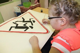 В поддержку специального проекта под руководством педагогов и сотрудников подмосковной Госавтоинспекции слабовидящие дети нарисовали дорожный знак «Дети», после чего сфотографировались с символом ответственного поведения на дороге и особого внимания к детям.