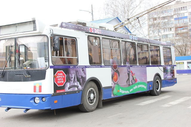 Инициативу сотрудников Госавтоинспекции о создании необычного троллейбуса поддержали в администрации Армавира и в троллейбусном управлении. Украсить общественный транспорт решили плакатами социальной рекламы, напоминающими основные правила дорожного движения, нарушение которых чаще всего приводит к авариям. Теперь на улицах города курсирует троллейбус с призывами соблюдать скорость и дистанцию, действовать по правилам, использовать детское автокресло и ремень безопасности, а также пропускать пешеходов.