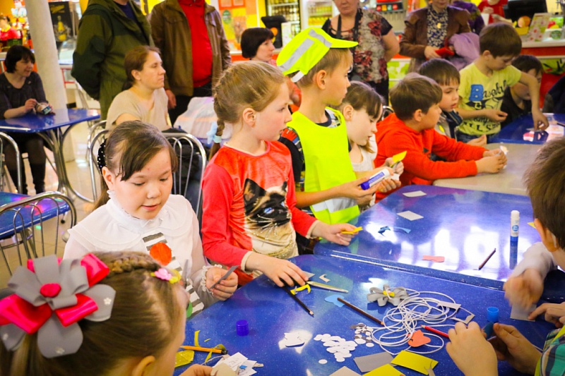 Сначала дети вместе с родителями – покупателями торгового центра – на мастер-классе своими руками сделали из светововращающей ленты брелоки, значки и заколки. Прикладное семейное творчество сопровождалось рассказом об истории катафота, а также о правилах его применения водителями и пешеходами в зарубежных странах.