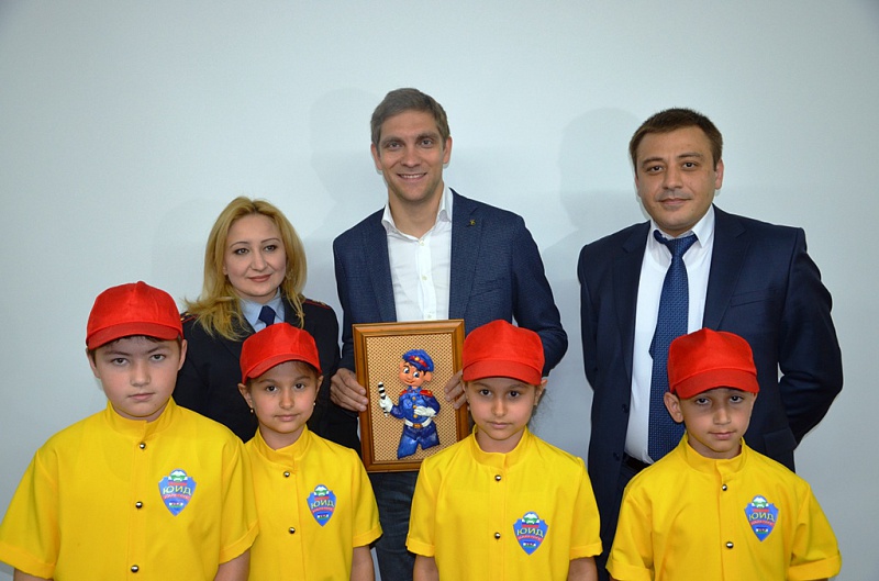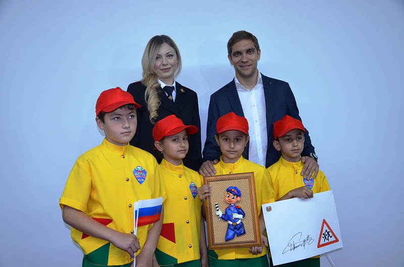 В честь юбилейного года юные помощники Госавтоинспекции вручили спортсмену сувенир, сделанный своими руками, и в знак поддержки идей безопасности на дорогах предложили оставить свой автограф на специальном плакате.