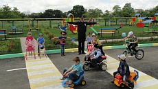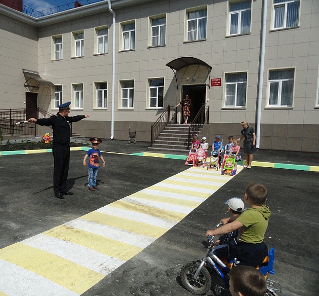 Первое занятие для воспитанников детского сада провел инспектор ГИБДД; урок был посвящен изучению жестов регулировщика. В ближайшее время здесь появится макет светофора, пока ребята учатся соблюдать правила дорожного движения по командам автоинспектора.