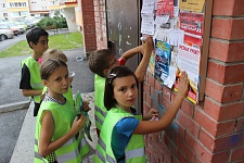 Юные помощники вместе с сотрудниками полиции расклеили памятки на стендах для объявлений жилых домов с основными рекомендациями безопасного поведения на дороге.