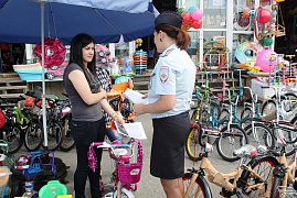 Полицейские разместили в помещениях продаж специальные обучающие брошюры, которые содержат правила безопасного передвижения несовершеннолетних на двухколесном транспорте, а также рассказали взрослым и детям о последствиях безответственного поведения маленьких любителей велосипедов.