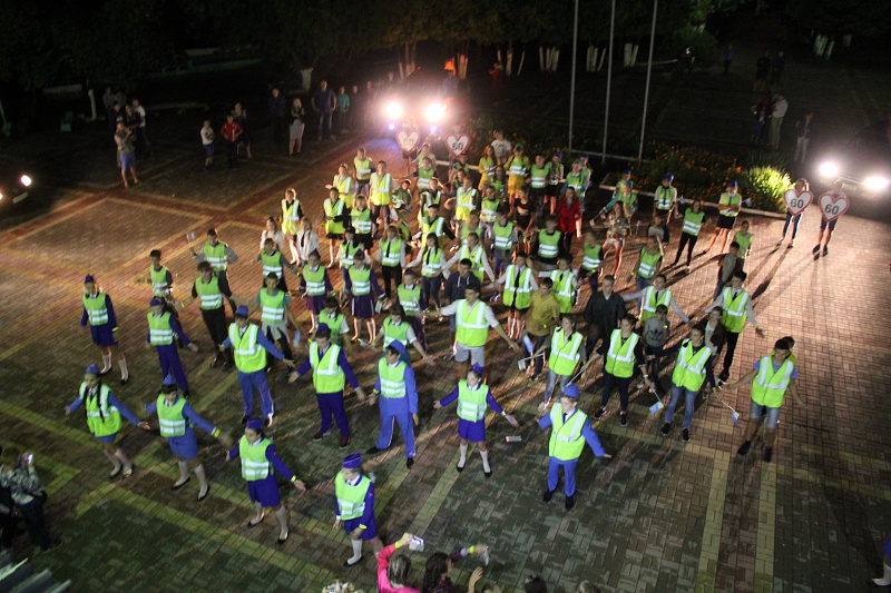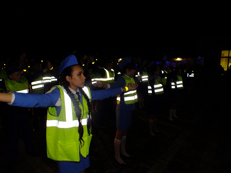 Предварял массовое выступление показательный танец, посвященный 80-летнему юбилею Госавтоинспекции, который исполнили юные инспекторы из Ельца. Несмотря на окружавшую танцоров темноту, благодаря световозвращателям зрители отлично видели все хореографические элементы.