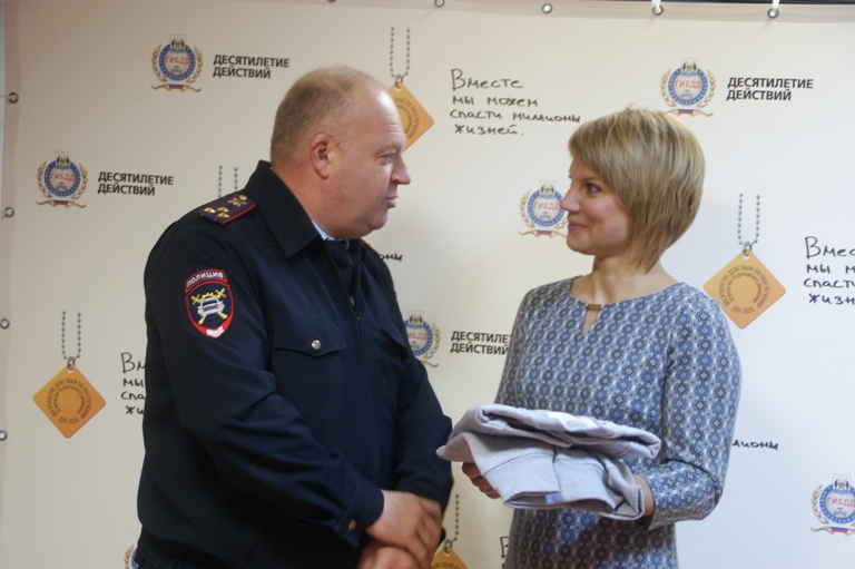 Руководитель региональной Госавтоинспекции Владимир Лонский поздравил Светлану Иванову - победительницу фотоконкурса «Я двигаюсь навстречу безопасности», проходившего в рамках социальной кампании «Навстречу безопасности», а также поблагодарил за неравнодушное отношение к проблеме дорожно-транспортного травматизма.