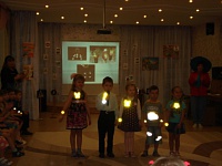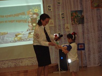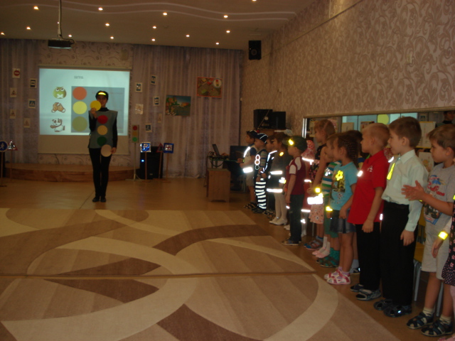 Воспитанники детского сада продемонстрировали для родителей и сверстников, а также сотрудников Госавтоинспекции знания Правил дорожного движения. В гости к детям приходили Светофор и Незнайка. В игровой форме дети повторили сигналы светофора, спели песню про дорожные знаки. Мальчишки и девчонки читали стихи и пели частушки о необходимости использования и ношения световозвращающих элементов.