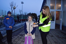 Взрослые, неравнодушные к проблемам безопасности пешеходов, надев яркие жилеты, проверили наличие световозвращающих приспособлений на одежде и инвентаре юных спортсменов, а также провели блиц-опрос о навыках ориентирования детей на вечерних дорогах.
