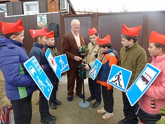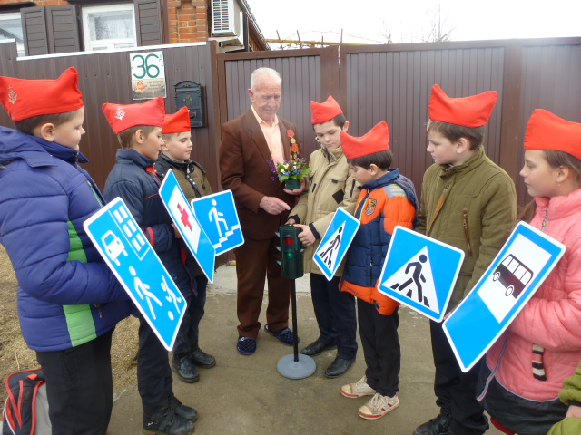 В рамках просветительского проекта «Школа безопасности пожилого человека» учащиеся школы г. Кропоткина провели надомные занятия с пенсионерами, которые проживают рядом со школой. В преддверии праздника Дня защитника Отечества юные инспекторы движения отправились к ветерану Великой Отечественной войны Алексею Горяинову, которому исполнился 91 год.