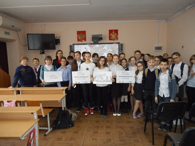 После просмотра фильма школьники вмести с инспектором по пропаганде безопасности дорожного движения обсудили проблему безопасности пешеходов, а затем сделали совместное фото в поддержку кампании.