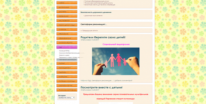 Разделы официальных сайтов, посвящённые безопасности дорожного движения, содержат полезную информацию для родителей, познавательные игры для маленьких детей, сценарии обучающих занятий, отчёты о проводимой в детском саду профилактической работе и много другой полезной информации.