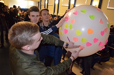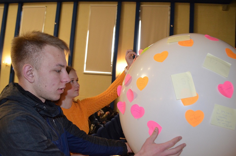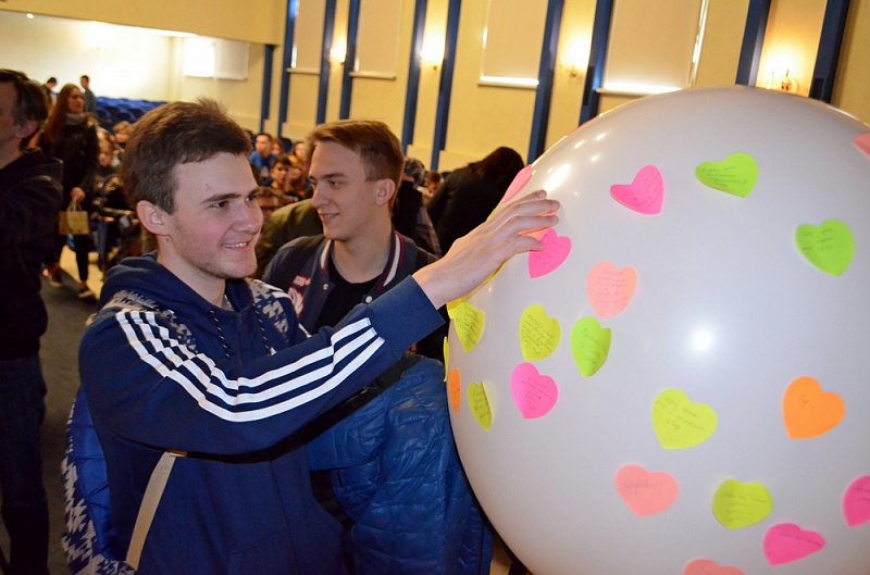 В начале встречи 250 студентов написали на разноцветных стикерах свои заветные мечты и приклеили их на большой воздушный шар, символизирующий жизнь.