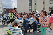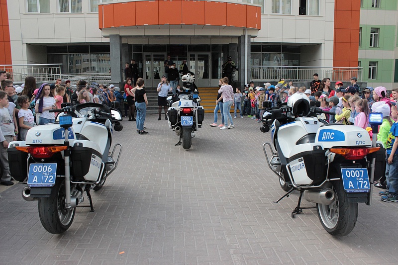 В тюменских пришкольных лагерях проходят флеш-мобы в поддержку городской акции #МыВсеЗаБезопасностьДетейНаДорогах! с участием инспекторов мотовзвода ДПС на патрульных мотоциклах.