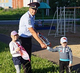 На детских площадках сотрудники Госавтоинспекции рекомендовали молодым мамам использовать световозвращающие наклейки на детских колясках. Вместе с полицейскими родители приняли участие в эксперименте, в ходе которого выяснили, что яркая наклейка позволяет водителю увидеть пешехода в ночное время намного раньше.