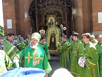 Прихожане Храма целовали Лик Преподобного Сергия Радонежского на баннерах, подносили малолетних детей к баннерам.