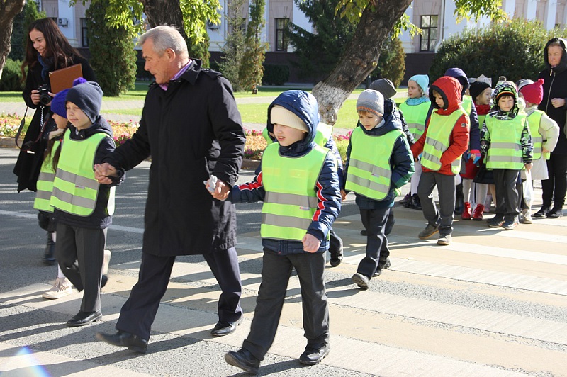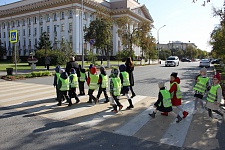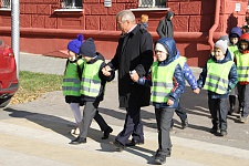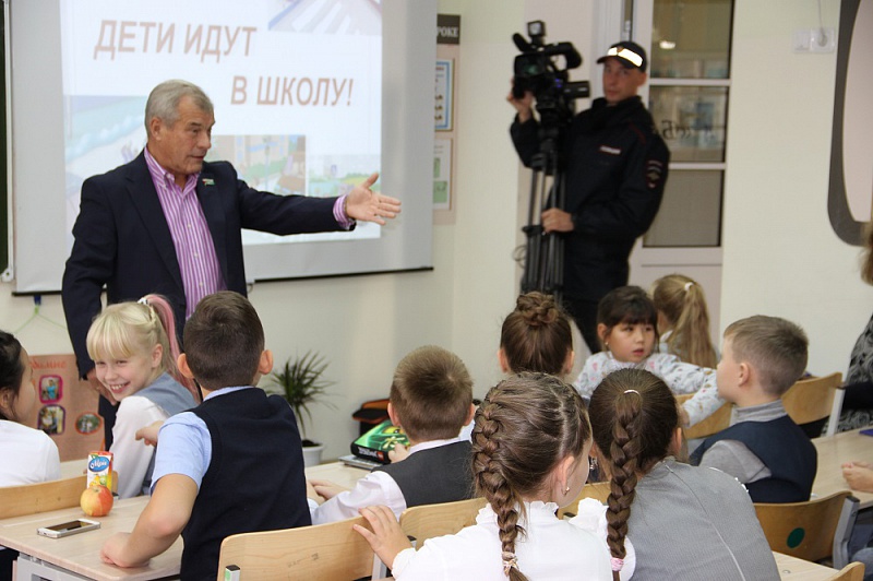 Депутат Тюменской областной Думы Владимир Ульянов перед теоретической частью урока провел «Шагающий автобус» из первоклассников по пешеходным переходам, расположенным вблизи школы. Парламентарий на практике показал детям, на что нужно обращать внимание на каждом этапе перехода проезжей части, как оценивать скорость и дистанцию до приближающихся автомобилей.