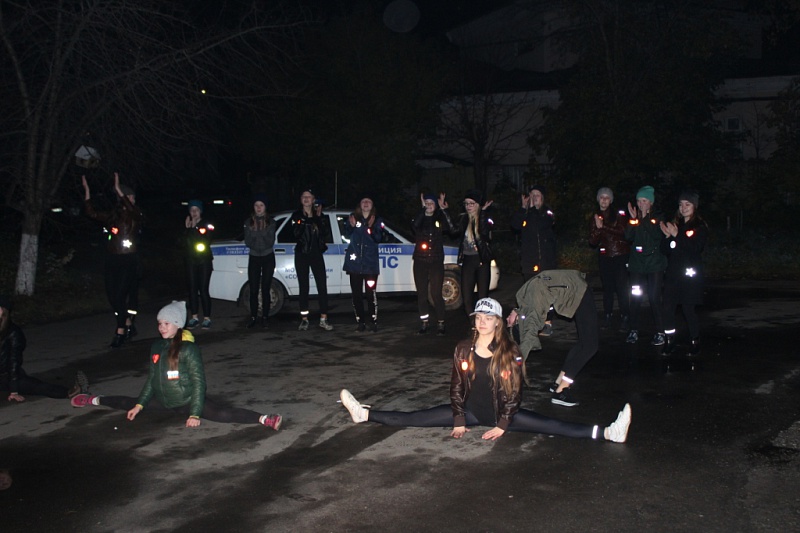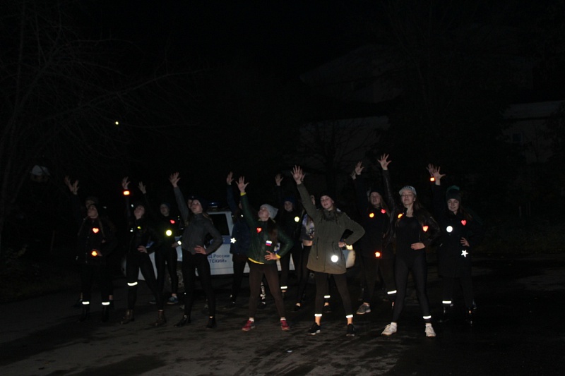 В знак поддержки повышения безопасности пешеходов на площадях и стадионах молодые люди в одежде со световозвращающими элементами синхронно и четко выполняют движения «светящихся» танцев, призывая участников дорожного движения стать заметнее на дорогах.