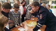 Родителям автоинспекторы предложили ответить на вопросы по знанию правил дорожного движения. За правильные ответы взрослым вручались тематические наклейки с призывами соблюдать дорожные правила.