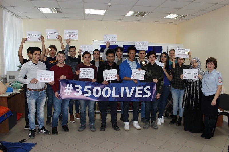 Автоинспекторы и студенты-медики на нескольких языках призвали участников дорожного движения к соблюдению норм безопасности на дорогах, осознанию личной ответственности за свое участие в дорожном движении. Студенты сделали памятные фото с хештегом всемирной социальной кампании по безопасности дорожного движения #3500LIVES, которые разместили на своих страницах в интернете.
