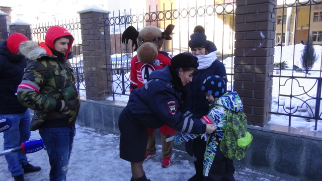 Импровизированный лось Автик – талисман хоккейного клуба – был привлечен хоккеистами для работы с пешеходами. На переходах через дороги города спортсмены рассказывали каждому пешеходу о том, что на одежде обязательно должны быть световозвращающие элементы. И дарили нарукавники с логотипами клуба.
