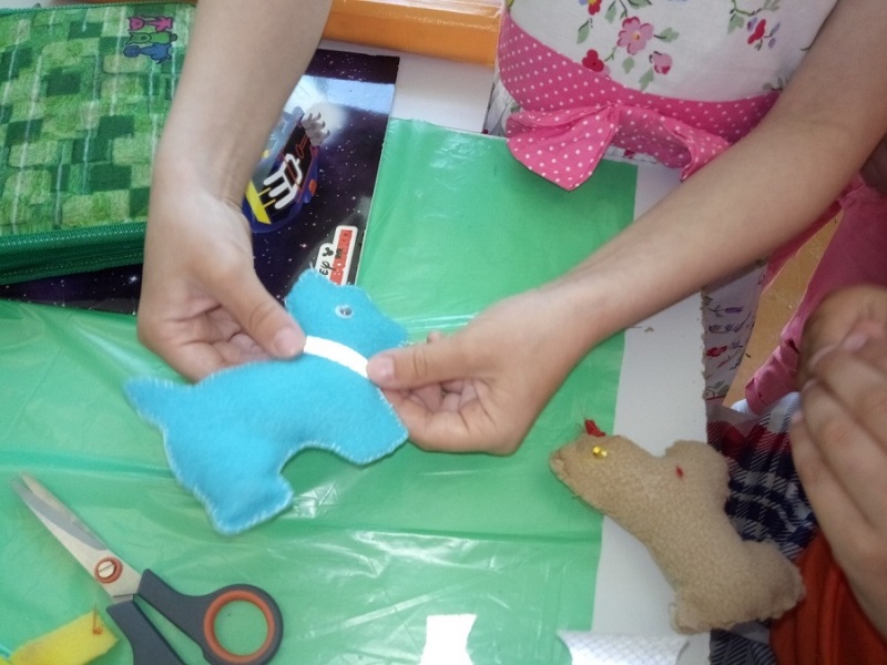 На первом занятии школьники сшили мягкие игрушки-брелоки со «светящимися» элементами и тут же прикрепили их к своим рюкзакам. Кроме брелоков, дети делают подвески, браслеты, наклейки, словом, все полезные аксессуары из световозвращающих материалов.