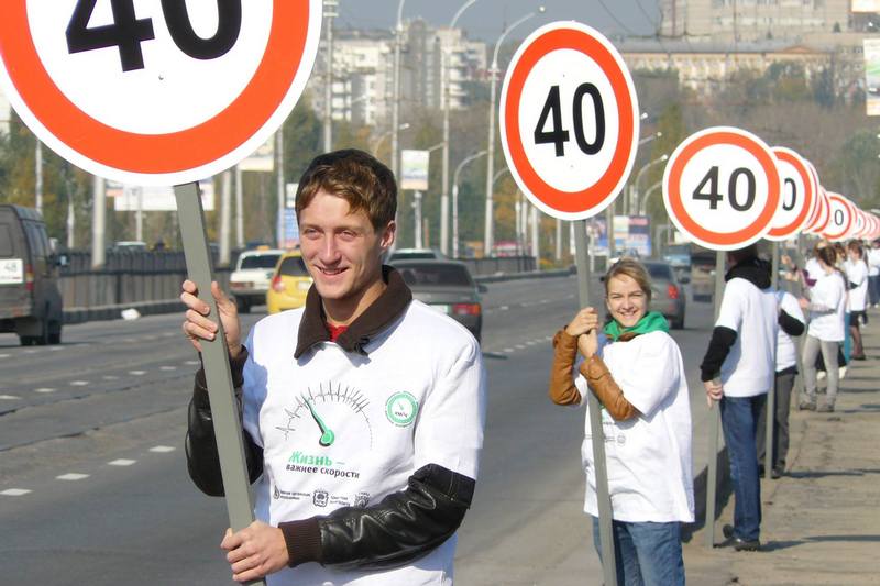 На обочине одной из самых оживленных улиц города молодые люди выстроились, держа в руках дорожные знаки, обязывающие водителя снизить скорость перед «зеброй». Проезжающие мимо автомобилисты реагировали положительно: здесь нужно быть предельно внимательными, это пешеходный переход.
