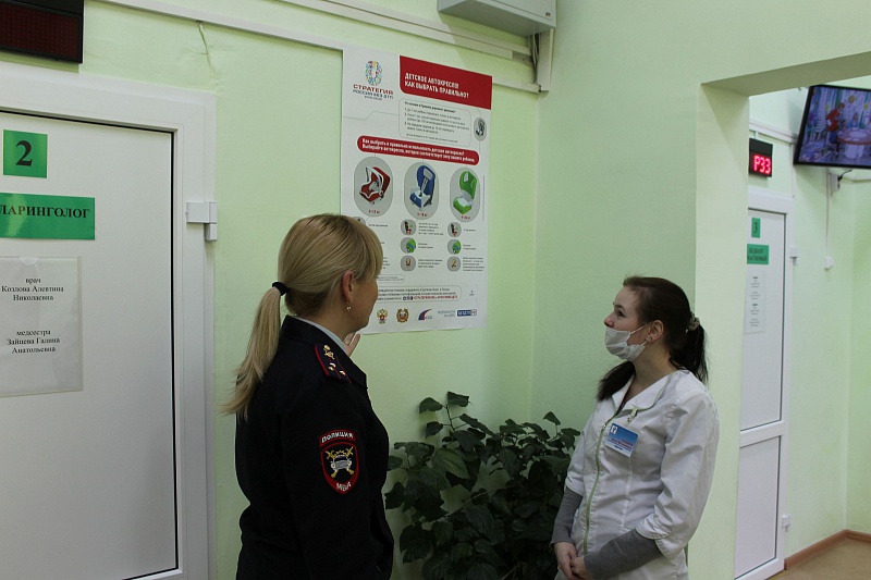 В лечебных учреждениях сотрудники Госавтоинспекции проводят индивидуальные занятия с посетителями, разъясняя правила безопасной перевозки детей в автомобиле.