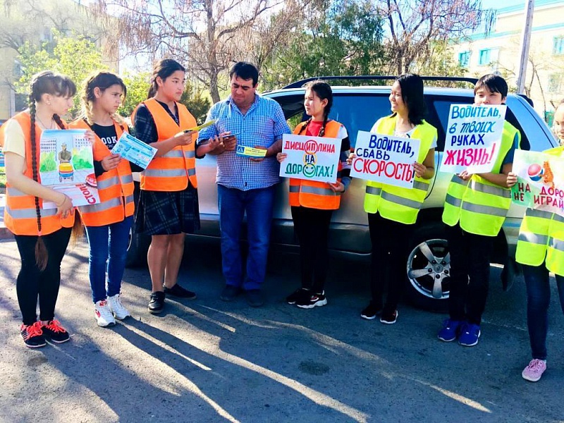 Автоинспекторы с отрядом юных инспекторов движения и волонтерами провели на центральной площади города Байконур профилактическую акцию «Дети космического города за безопасные дороги».