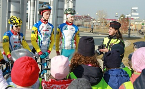 Юные чемпионы по велоспорту продемонстрировали свои пассивные средства защиты и помогли школьникам правильно надеть и застегнуть велошлемы. Участники акции получили от Госавтоинспекции световозвращатели и памятки для велосипедистов.