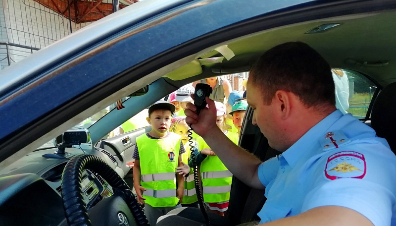В завершение урока к ребятам подъехал настоящий полицейский автомобиль ДПС. Инспекторы показали детям, как действуют специальные звуковые и световые устройства, которыми оборудован служебный транспорт ГИБДД.