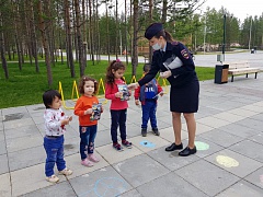 Работая над рисунками на асфальте, полицейские рассказывают ребятам об опасностях, которые могут подстерегать на дорогах, объясняют, как правильно переходить улицу, где безопасно кататься на велосипеде и в каких местах следует играть с друзьями. После такого экскурса автоинспекторы раздают детям цветные мелки, а те рисуют тематические рисунки по Правилам дорожного движения.