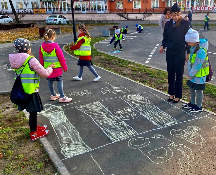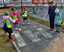 Вернувшись в школу, дети приняли участие в творческой части обучения: они нарисовали на асфальте изображения различных объектов дорожной инфраструктуры: светофоры, «зебры», дорожную разметку.