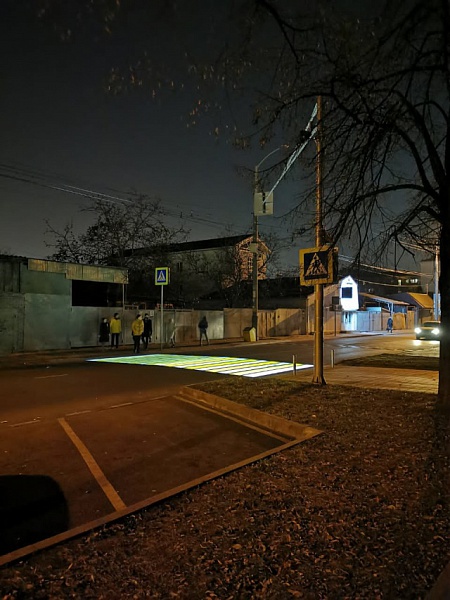 В тестовом режиме работают два светодиодных проектора горизонтальной дорожной разметки 1.14.1 «Пешеходный переход». Специальный лазерный проектор подсвечивает пешеходный переход, чтобы разметку было видно издалека в темноте, во время дождя, снега или тумана.