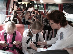 Организованную перевозку группы детей необходимо проводить в автобусе с опознавательными знаками «Перевозка детей». Такие требования содержатся в ПДД и Правилах организованной перевозки групп детей автобусами. Скорость движения при этом не должна превышать 60 км/ч. На задней части корпуса автобуса должен быть установлен опознавательный знак «Ограничение скорости», на крыше или над ней должен быть включен маячок желтого или оранжевого цвета, обеспечивающий угол видимости 360 градусов в горизонтальной плоскости. Во время движения дети должны быть пристегнуты к креслам ремнями безопасности, отрегулированными в соответствии с руководством по эксплуатации автобуса.