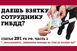 Борьба с коррупцией - одно из приоритетных направлений деятельности МВД РФ. ГИБДД Хабаровского края напоминает жителям региона: получение взятки должностным лицом, а также дача взятки должностному лицу лично или через посредника влечёт наказание в виде наложения штрафов в крупных размерах либо исправительных работ. Максимальное наказание – лишение свободы на срок до 15 лет.