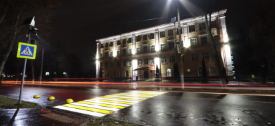 Лазерный проектор подсвечивает пешеходный переход в дополнение к классической дорожной разметке. Это улучшает видимость «зебры» и переходящих по ней людей. Инновационное устройство установлено рядом с образовательной организацией, потому что пешеходов здесь много.