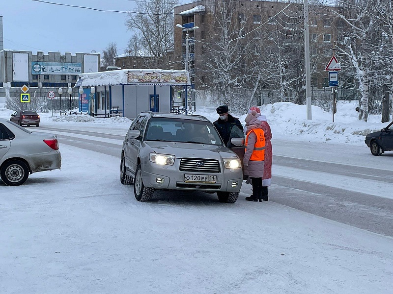 На дорогах Сосногорска совместно с сотрудниками ГИБДД дежурили Дед Мороз и Снегурочка. Они поздравляли горожан с наступающим Новым годом.